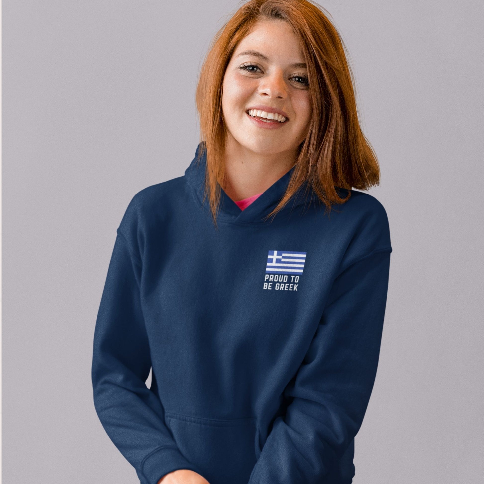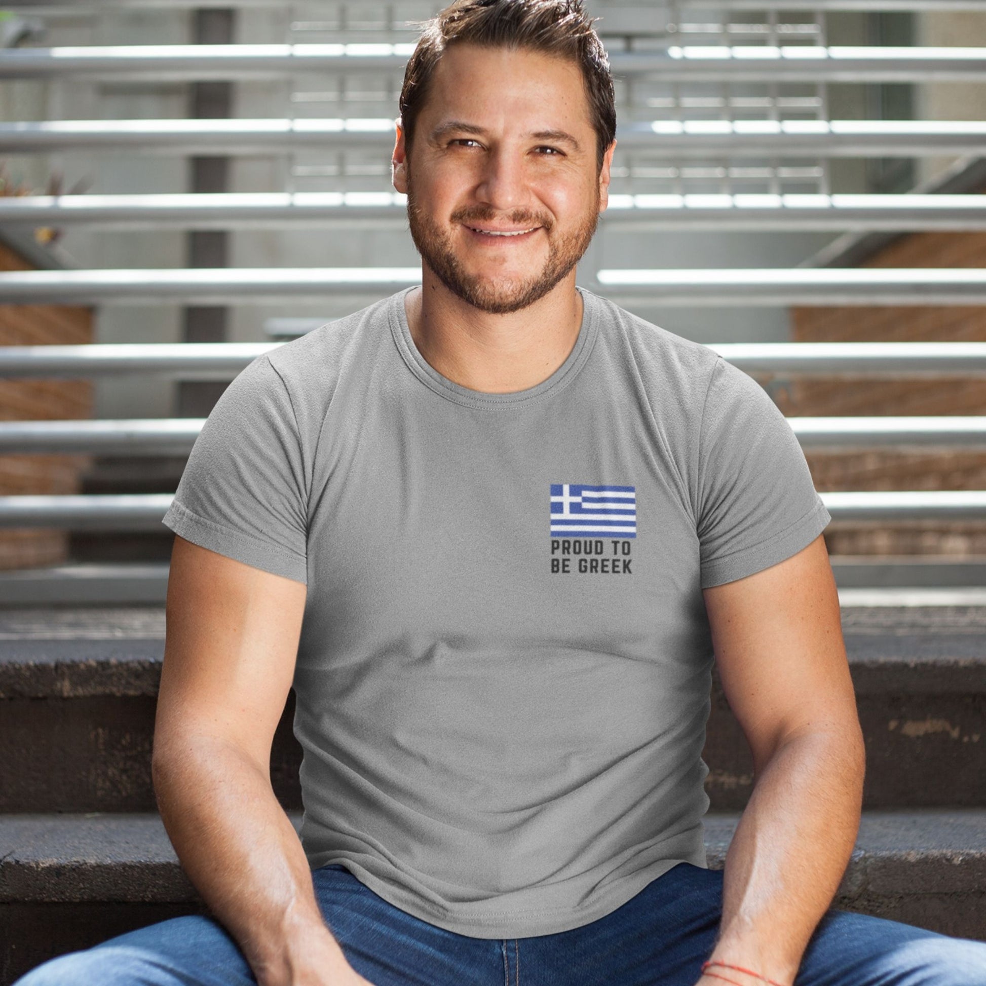 Celebrate your Greek heritage with this stylish T-Shirt or Sweatshirt featuring a bold Greek Flag Chest Print. The phrase 'Proud to be Greek' is prominently displayed beneath the flag, making a statement about your cultural pride. Available in multiple sizes, it's perfect for everyday wear or the Greek Independence Day Parade. Show off your love for Greece with this eye-catching and patriotic shirt.